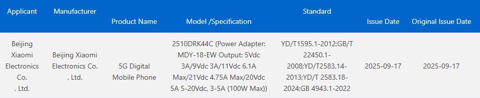 Today, the Redmi K90 with model number 2510DRK44C appeared on China’s 3C certification website. The certificate indicates the device supports 100W fast charging and comes with an MDY-18-EW charger. Compared to the 90W fast charging of the Redmi K80, the charging specifications have seen a slight upgrade.